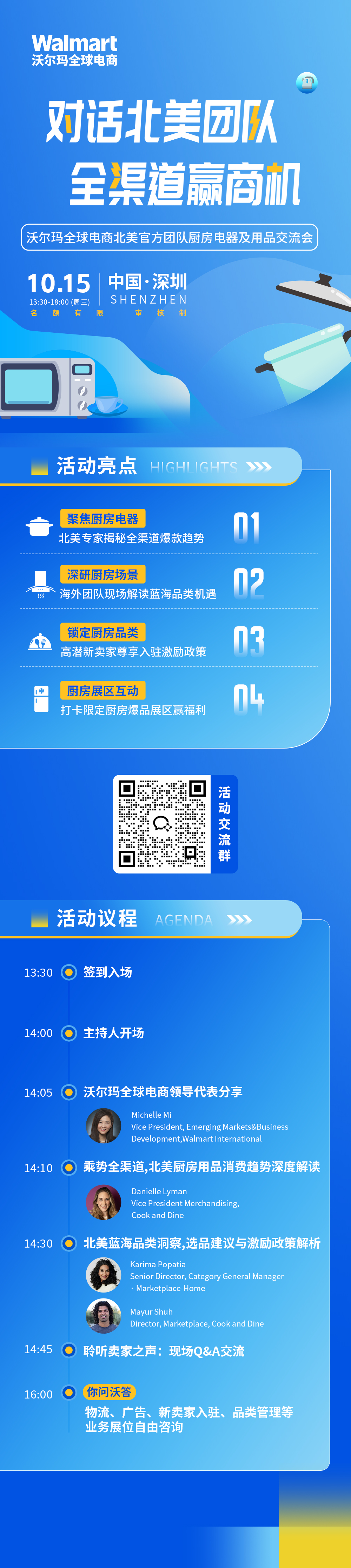 时间: 10-15 13:30 ~ 10-15 16:00 主办方: 沃尔玛 活动方式: 线下 活动地址: 深圳市福田区 剩余名额: 99 / 100 简介: 沃尔玛全球电商北美团队厨房电器及用品交流会