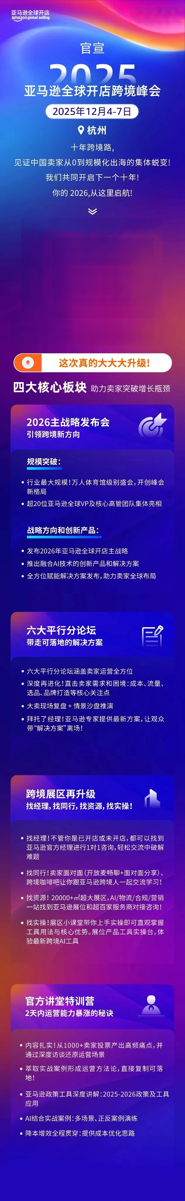 时间: 12-04 09:00 ~ 12-07 00:00 主办方: 亚马逊全球开店 活动方式: 线下 活动地址: 杭州市 - 拱墅区 剩余名额: 300 / 300 简介: 四大核心板块助力卖家突破增长瓶颈
