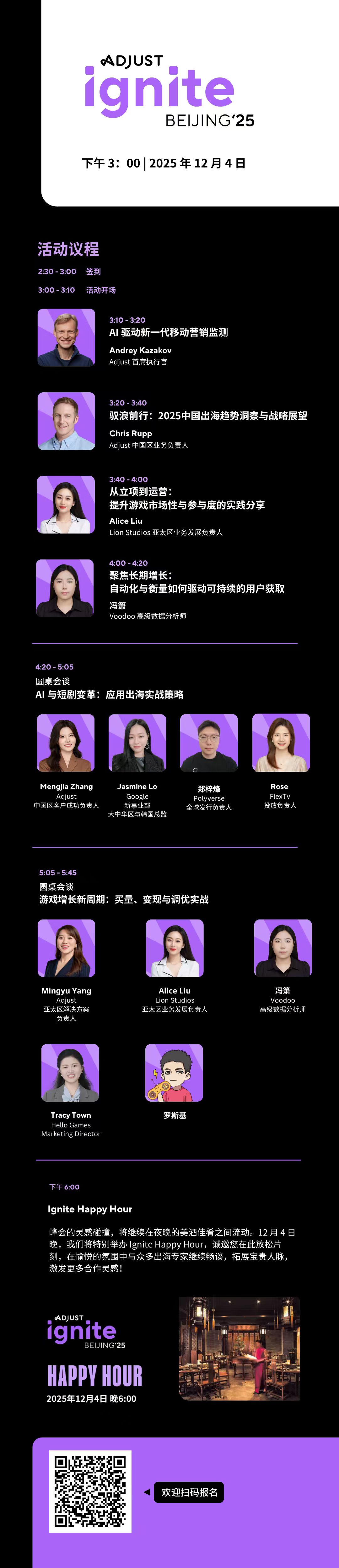 时间: 12-04 15:00 ~ 12-04 18:00 主办方: Adjust 活动方式: 线下 活动地址: 东城区 - 北京市 剩余名额: 300 / 300 简介: 全球移动应用最新变革与机遇 中国 APP 出海未来增长战略前瞻 构建增长飞轮,业内实战案例揭秘 与行业领袖面对面交流成功经验