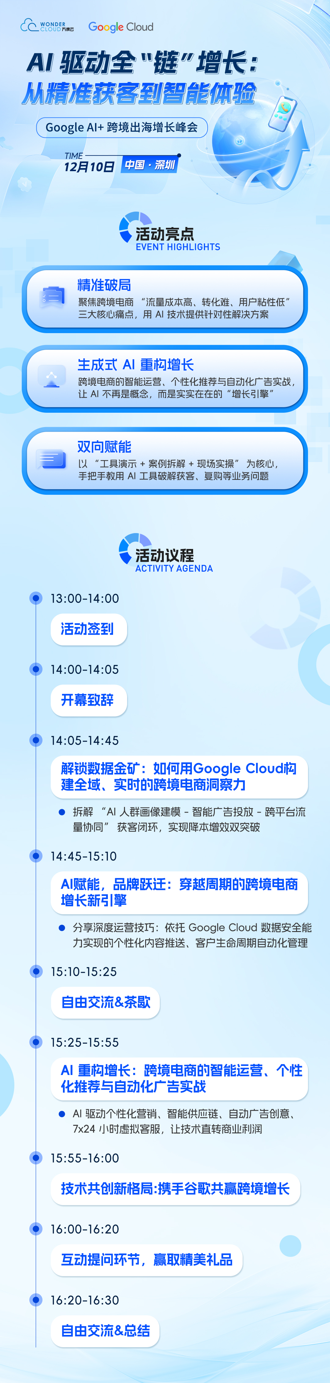时间: 2025-12-10 ~ 2025-12-10 主办方: Google Cloud 活动方式: 线下 活动地址: 深圳市 - 南山区 剩余名额: 200 / 200 简介: Google AI+ 跨境出海增长峰会
