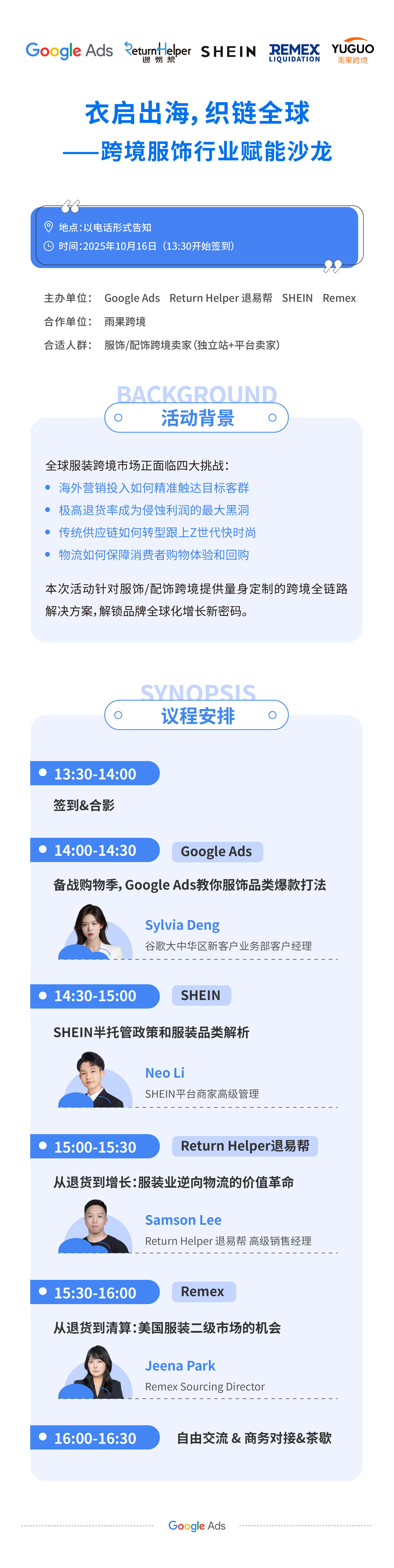 时间: 10-16 13:30 ~ 10-16 16:30 主办方: Google Ads 活动方式: 线下 活动地址: 广东省广州市番禺区 剩余名额: 99 / 100 简介: 衣启出海,织链全球