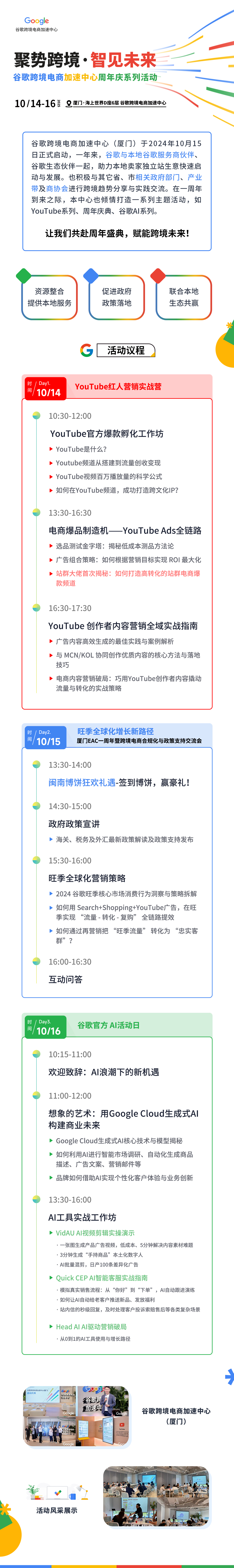 时间: 10-14 09:30 ~ 10-16 17:30 主办方: 谷歌跨境电商加速中心 活动方式: 线下 活动地址: 福建省厦门市湖里区 剩余名额: 99 / 100 简介: 聚势跨境 智见未来 谷歌跨境电商加速中心周年庆系列活动厦门站