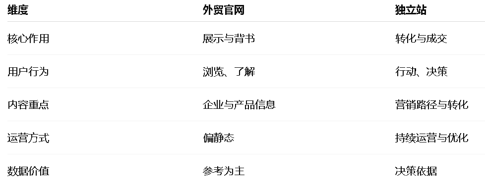但从业务定位和运营目标来看,外贸官网与独立站往往承担着完全不同的角色。